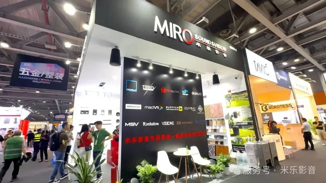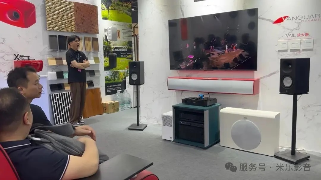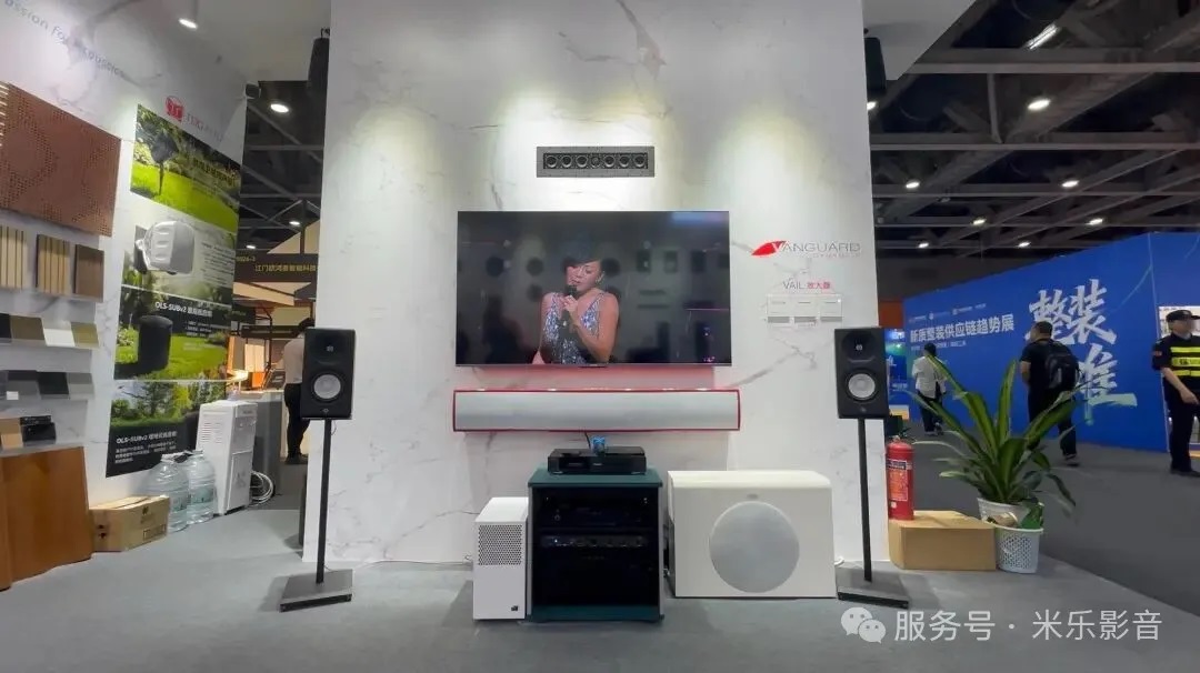 以往米乐影音参与的音响展,都是展示大型定制安装家庭影院系统,这次在定制家居展上,就把客厅影院的概念重点提出,展示的内容也集中在“空间+系统”的结合方式上。从客厅影院方案,到嵌入式音响、声学处理,再到播放与显示设备,整体呈现出一套可以直接融入家装流程的影音系统路径。