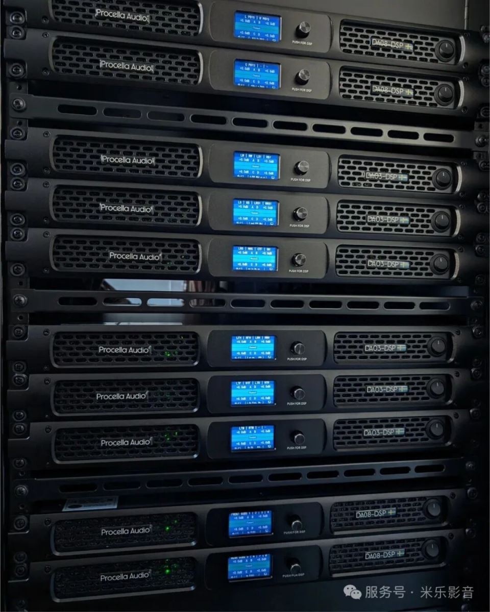 6台DA03-DSP功放精准调控所有环绕与天空声道,为沉浸式音轨提供精确和高动态冗余的输出。