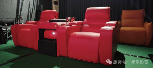 就如米乐于视听展展示的一款二人座椅,就按米乐的规定,把SIM2 X80的投影机,藏于两座椅中间,不少发烧友来到米乐展房,都在找投影机到底藏在那个地方!
