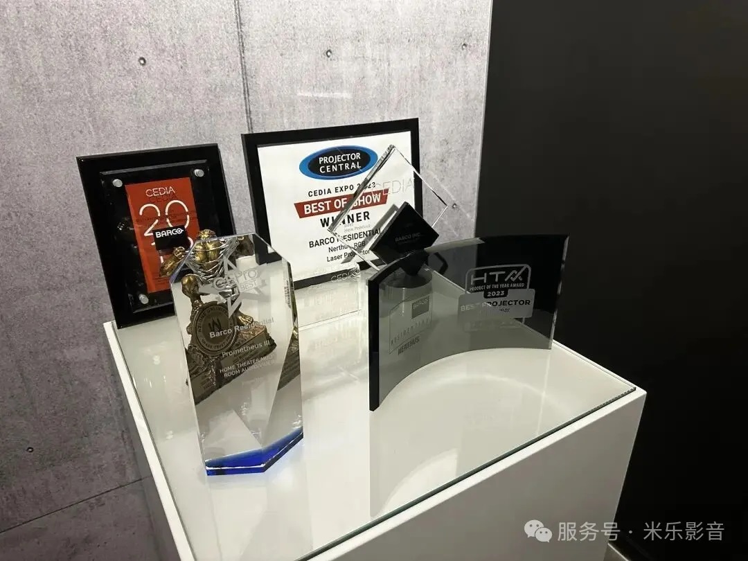 比较特别的是,这个房间还获得了非常多的奖项,其中就有CEDIA在2019年颁发的最佳家庭影院方案的奖牌。和工作人员简单了解之后,这个房间的声学部分特别出众,而且投影幕的尺寸设计和房间的匹配度很高,因此视觉效果感觉也相当好。