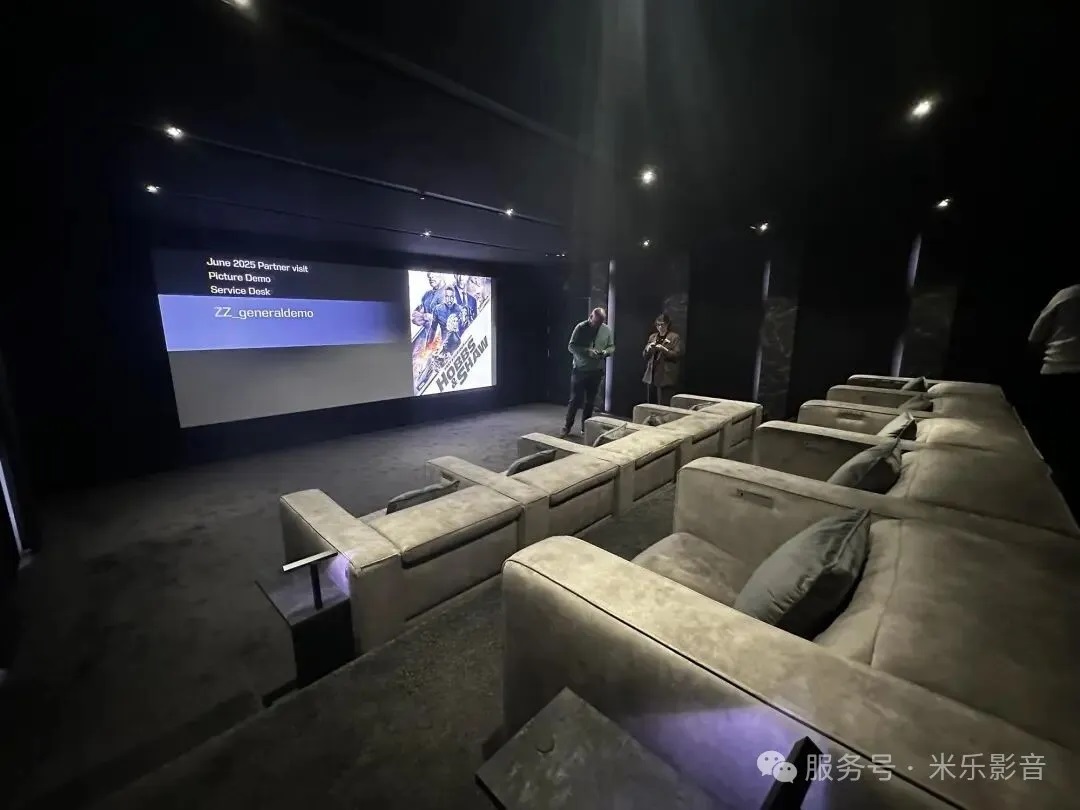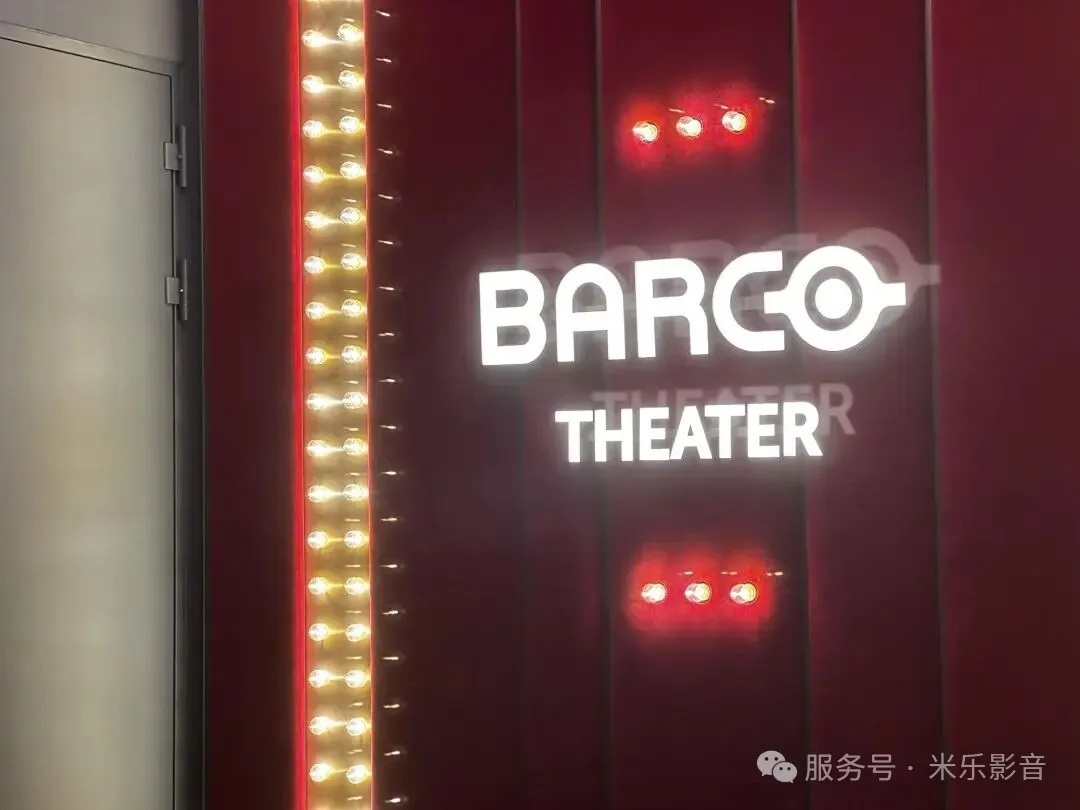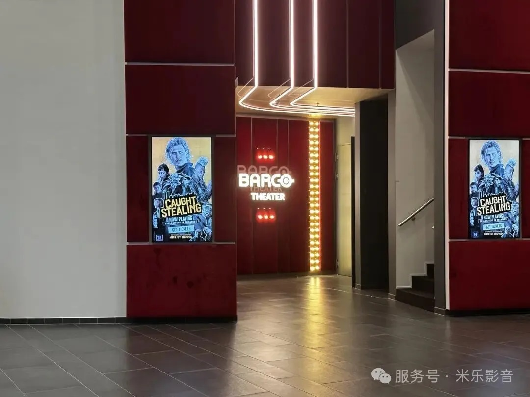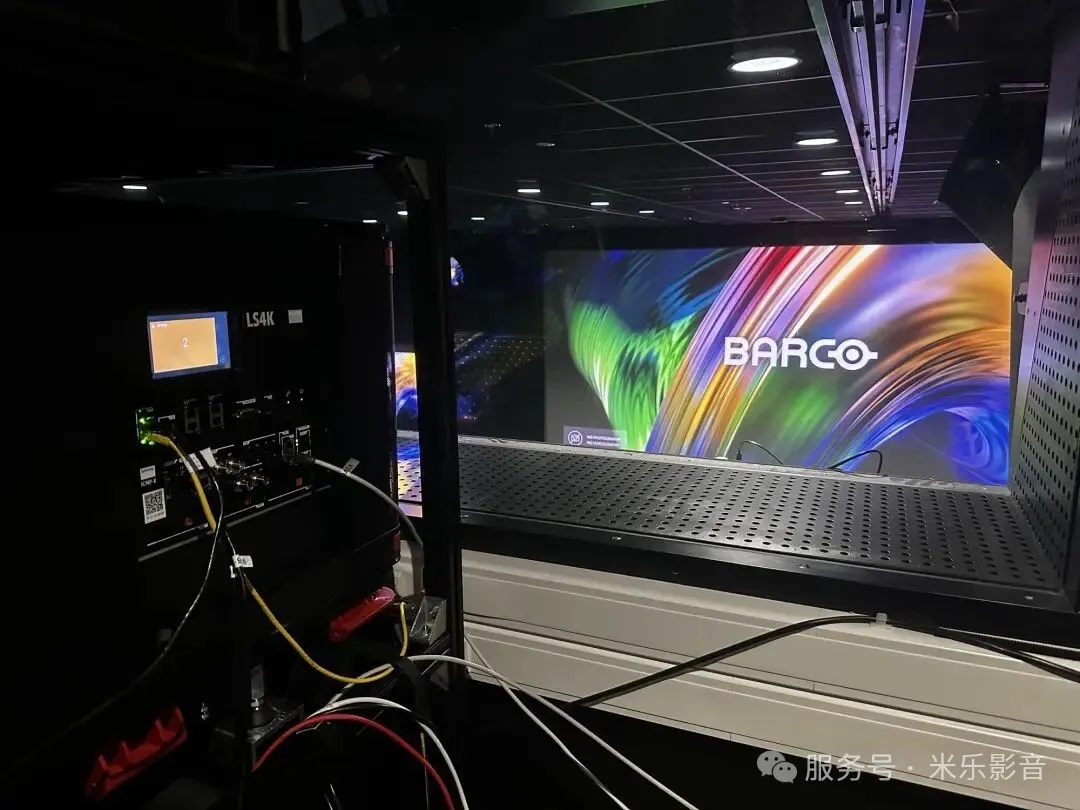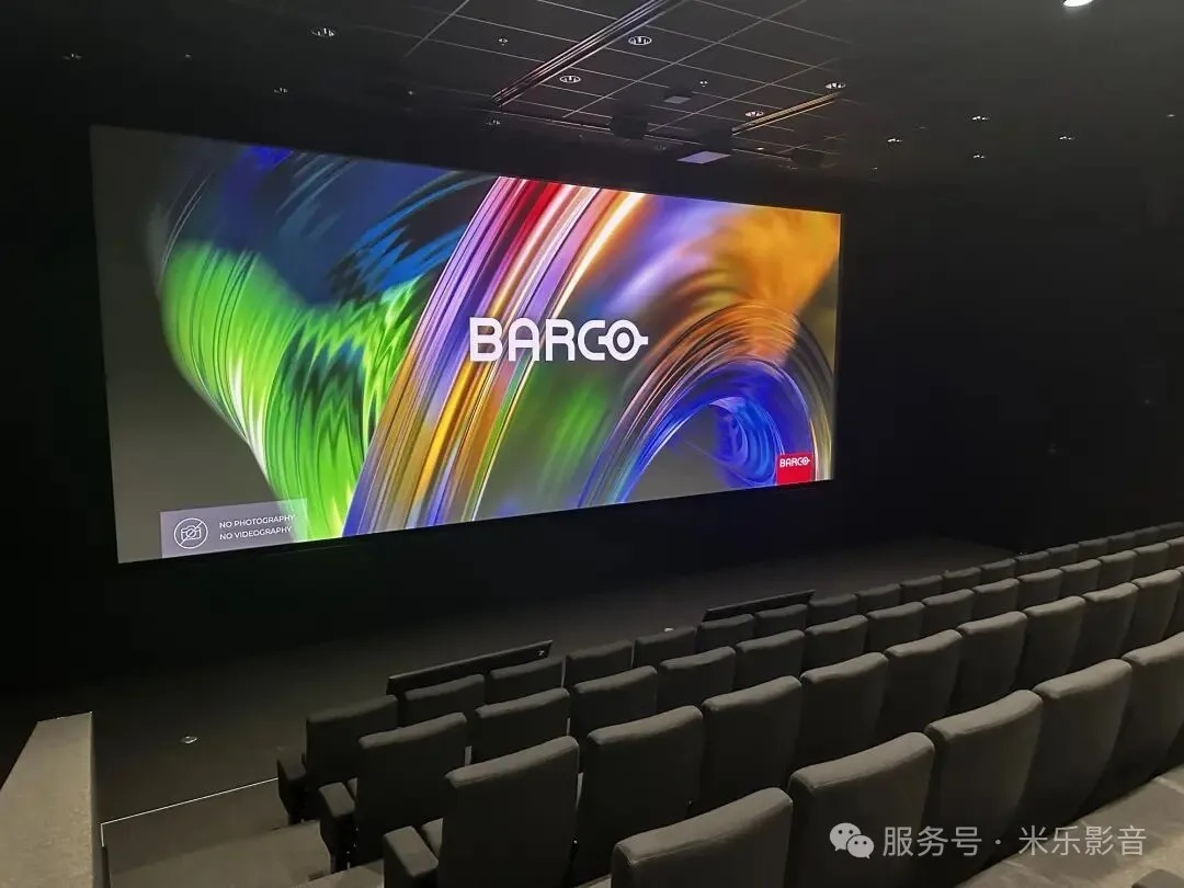 首先进入的是Barco Theater,这是一个专业的商用电影院放映厅,设立了沉浸式环绕声系统以及100多个座位,投影机采用了LS4K这款机型,现场展示使用的是 11 米、增益 1.0 的哑白幕,没有金属幕涂层,就是标准影院条件。