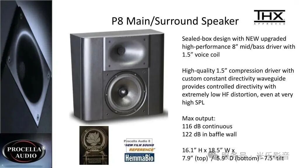 在产品方面,例如P8、P18就拥有“THX Approved”这一标识。这说明该型号经过设计以符合专业多声道影院/混音室的性能要求,而非普通音箱。
