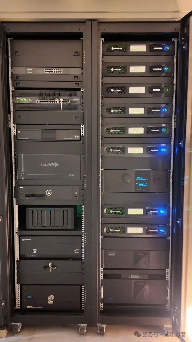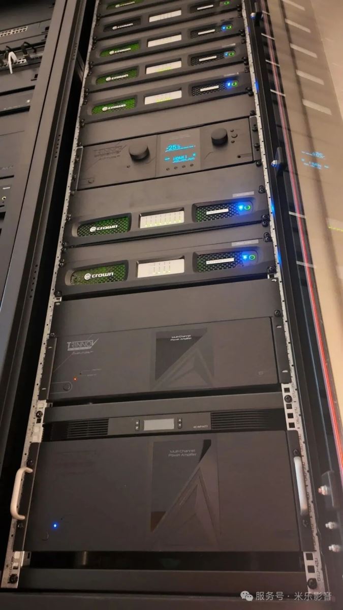 系统核心是运行在全34声道模式下的Trinnov Altitude32处理器。环绕和天空声道的功放由Trinnov的Amplitude8和8M负责,而大电流的Crown DCI功放则驱动左中右(LCR)主音箱和低音炮。