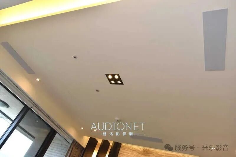 为什么屋主不选择5.1.2声道配置呢?因为侯先生的客厅属于半开放空间,无法将喇叭装在侧墙以达到天空声道效果。再者,三支喇叭都嵌入天花板之上,原本音场就有一定的高度,估计上方音效包围感也会比正规的7.1声道摆位更明显,所以恺锐将三支喇叭以“ㄇ”字型安装在天花板上,透过Skybar Satellite声波反射达到7.1声道的效果。