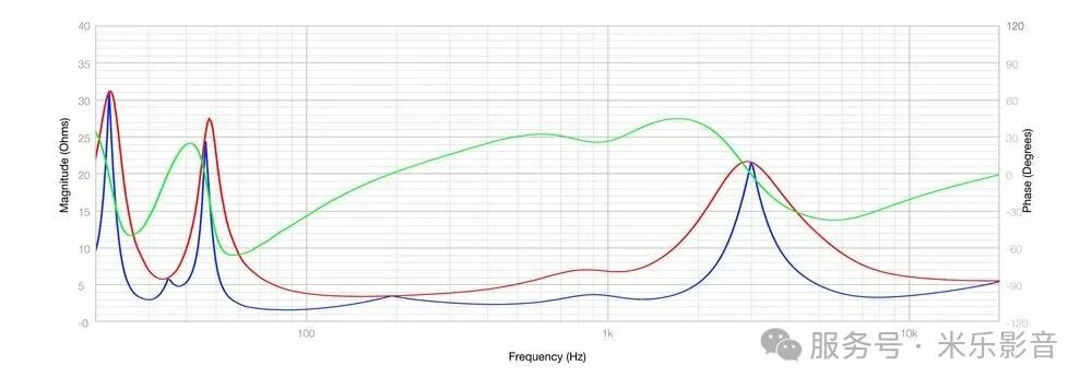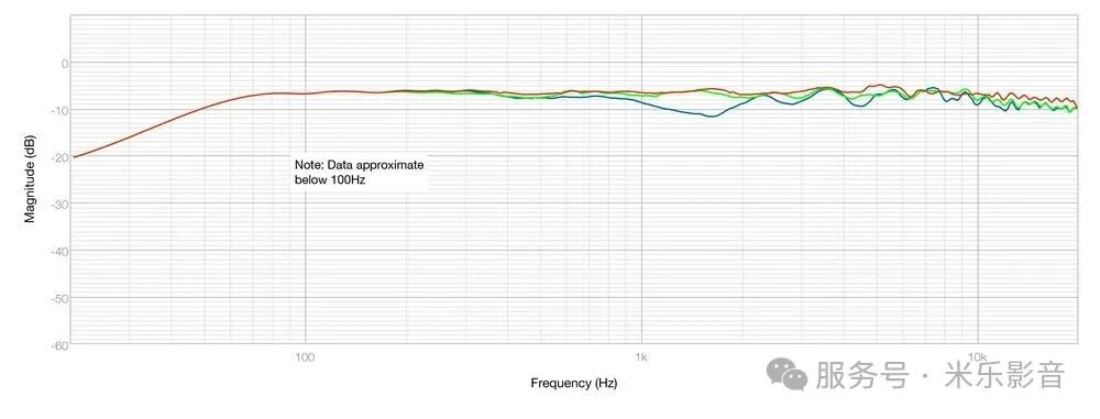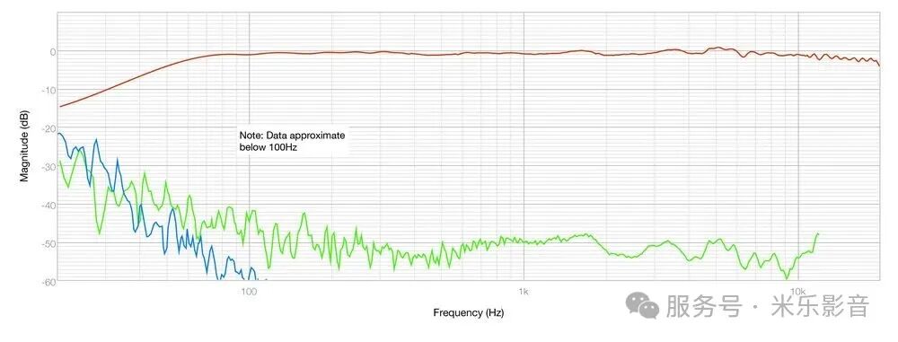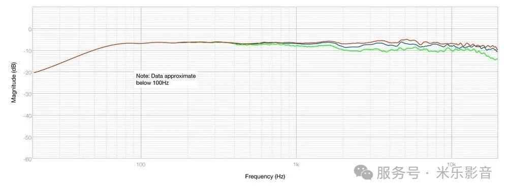 图表1:A6B的轴向频率响应(红色曲线),以及其二次和三次谐波失真产物(分别为绿色和蓝色)。其失真性能尤其出色