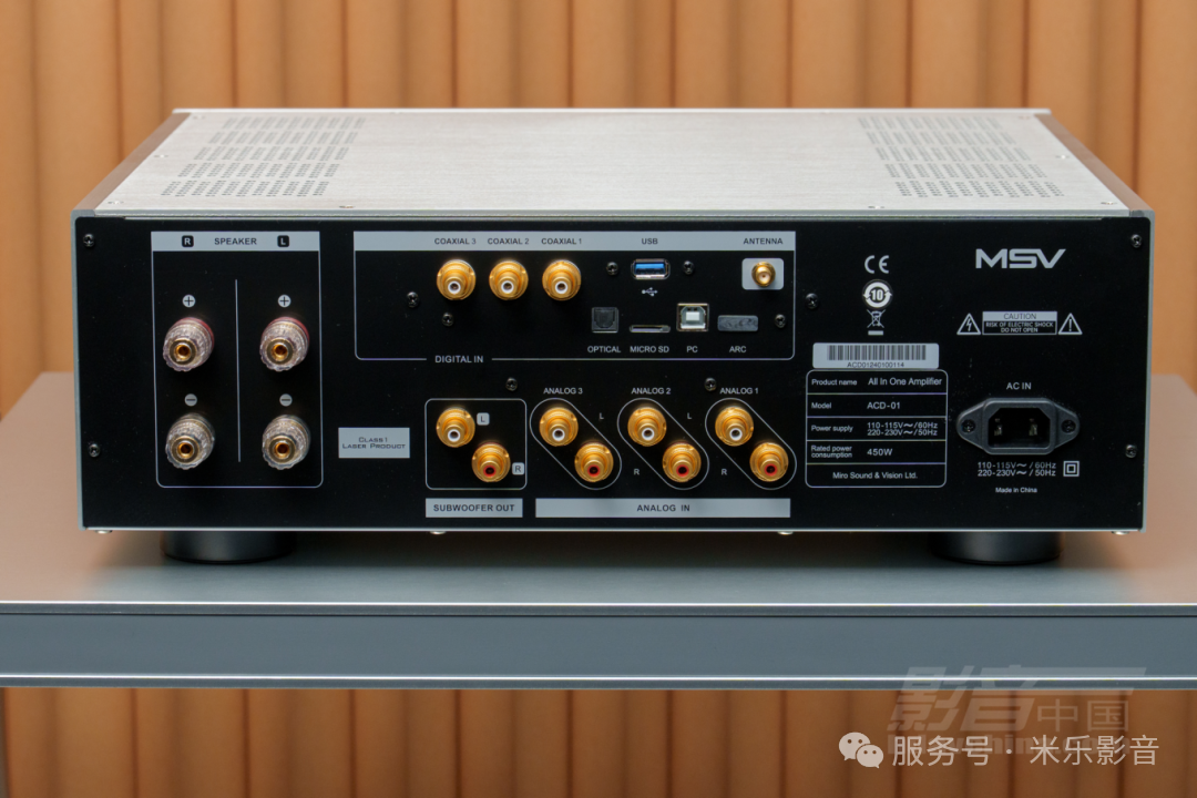 事实上,ASCILAB F6Bs并不是一对好推的音箱,标称灵敏度仅为84dB,在同尺寸书架箱中属于偏低水平,一定程度上非常考验功放的推力。此次与F6Bs搭配的,是MSV ACD-01一体式功放。这款产品由国内头部代理商米乐影音自主研发,将合并式功放与CD播放机整合于一体。在放大电路方面,ACD-01采用纯A类放大架构,在8欧姆负载条件下,每声道可提供130W的额定输出功率,最大输出功率更是高达370W。机身内部配备了大尺寸环形变压器,为整机提供充沛而稳定的电源支持;同时,内部不同功能区域进行了明确的物理隔离,并辅以针对振动抑制的结构设计,确保在高功率工作状态下依然维持良好的电气与机械稳定性。