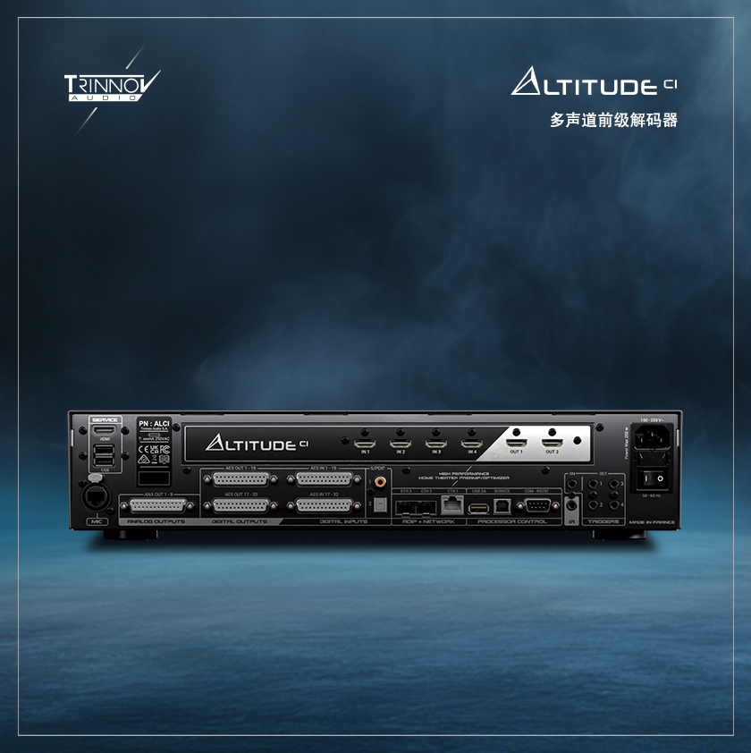 Altitude CI 音频处理器集双重原生 AES67 与 Dante 技术于一身,支持 8 至 32 声道配置,并采用 Trinnov 独家技术,能够灵活适配各类高端音频应用场景。作为同级产品中首款同时原生支持 Dante®及 Ravenna®/AES67 协议的处理器,它在消费级与专业级音频架构间实现了无缝兼容。这种"两全其美"的架构设计,既可通过 AES67直接集成杜比全景声®及 DCI 服务器,又能通过Dante 管理音频输出,无需外置转换器。