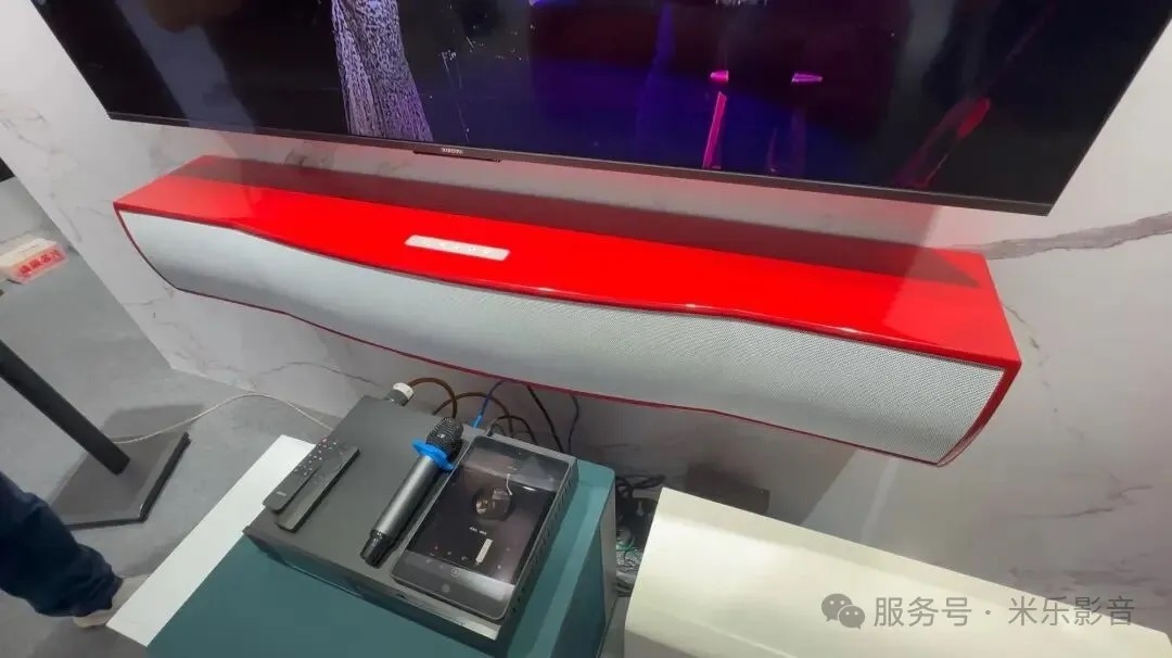 这次现场的核心,是一个完整的客厅影院方案。系统没有采用传统独立影音室的封闭结构,而是直接放在客厅环境中,与定制柜体、墙面结构一起规划。音箱、低音和声学处理都做了隐藏式处理,视觉上保持统一,同时保留多声道影院的功能结构。搭配的器材包括DanPro的吸顶扬声器组成的多声道系统,另外还有TDG Audio的Skybar产品,另外还有法国R_volution8K播放器以及Procella的AVR-1680多声道功放,客厅Hi-Fi音箱部分还带来了韩国AsciLab以及波兰Qualio Audio。在电视机下方还有Visione的Soundbar产品Primo。