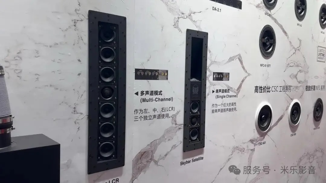 这次米乐影音带来了TDG Audio的完整嵌入式产品体系,覆盖In-Wall和In-Ceiling两种安装方式,从LCR主声道、环绕声道到Atmos顶部声道都有对应型号。在结构设计上,产品对于不同使用场景有很高的定制性,而且专门减少墙体环境对声音的影响,通过不同材质的单元,和可调高音单元改善指向性控制,给客户带来不同的搭配和组合体验。