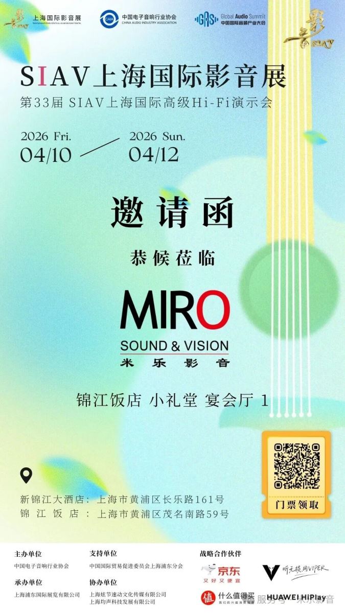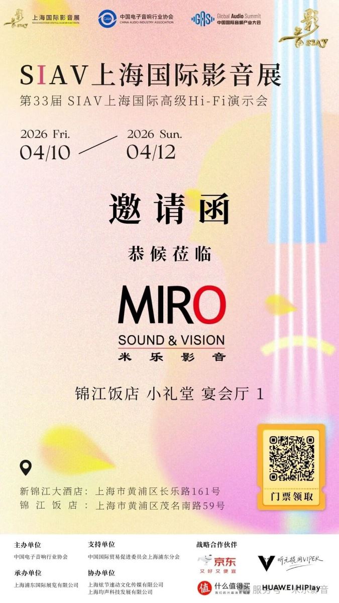 展会名称:SIAV上海国际影音展 日期:2026年4月10日(周五)~4月12日(周日) 地点:锦江饭店,上海市黄浦区茂名南路59号 米乐影音展房:锦江饭店小礼堂宴会厅1
