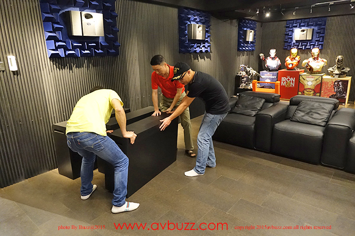 由於天花架是比人的高度為高,如無電動升降台幫助,是沒法把咁重的超低音,由地面放到天花架上。
