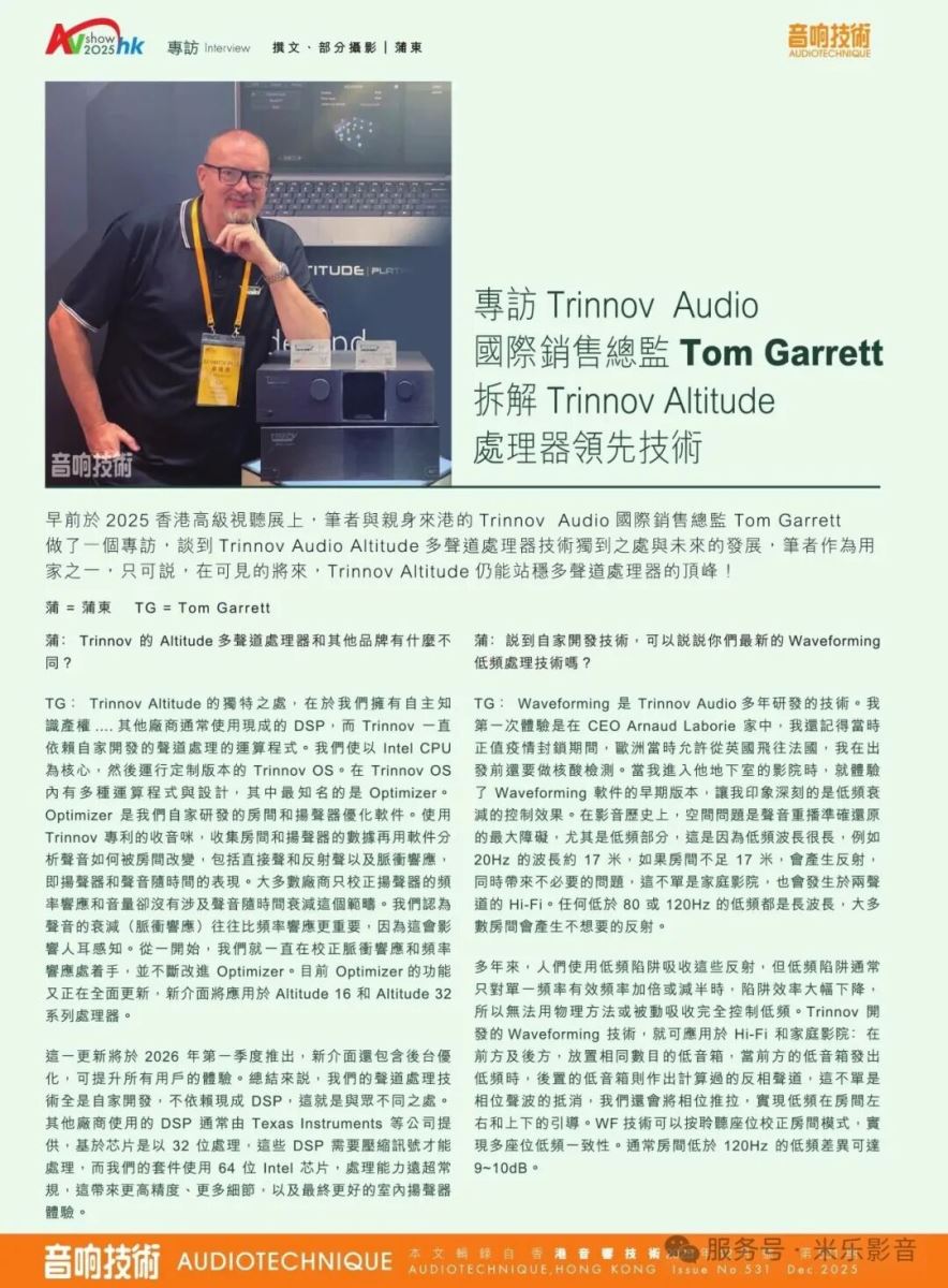 早前于2025香港高级视听展上,笔者与亲身来港的Trinnov Audio国际销售总监Tom Garrett做了一个专访,谈到Trinnov Audio Altitude多声道处理器技术独到之处与未来的发展,笔者作为用家之一,只可说,在可见的将来,Trinnov Altitude仍能站稳多声道处理器的顶峰!