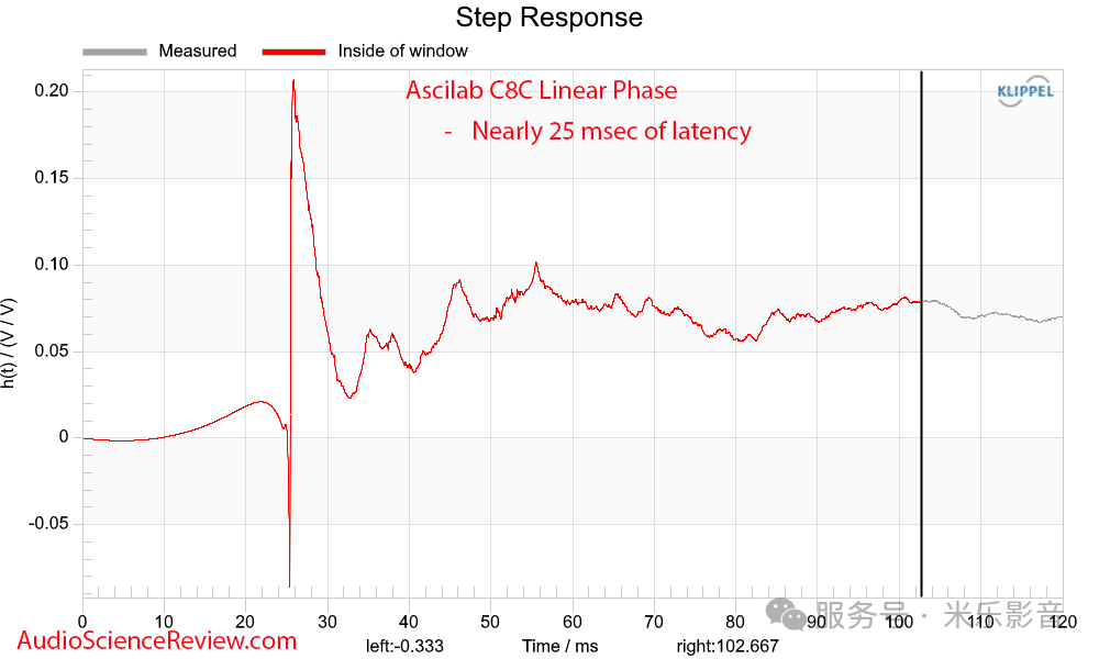 早期窗口显示高频略有提升,但有趣的是,当它和轴上响应在预测的室内响应中叠加时,这个提升就消失了。