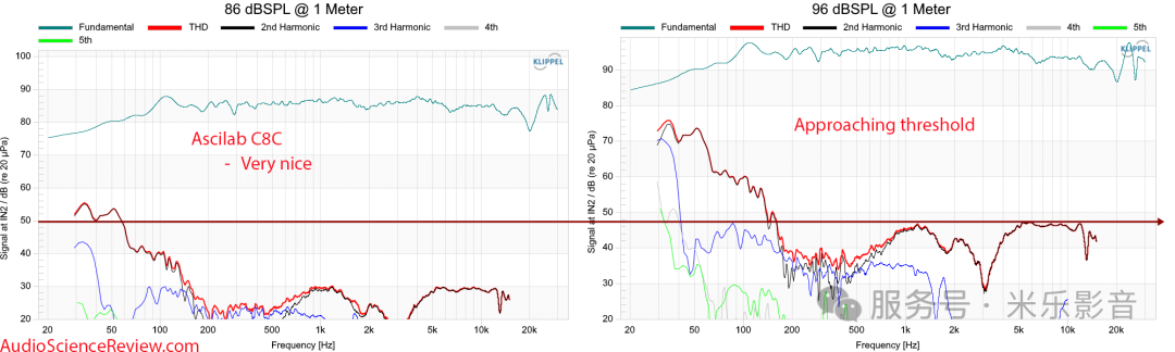 我们看到两种新的失真机制:一种在62Hz左右启动,另一种在40Hz启动。我认为前者不算太大的限制,但后者在101dB SPL时确实可以听出来。与A6B相比,C8C的极限要高得多,最大失真也更低。同样,我们将在听音测试中检查所有这些。