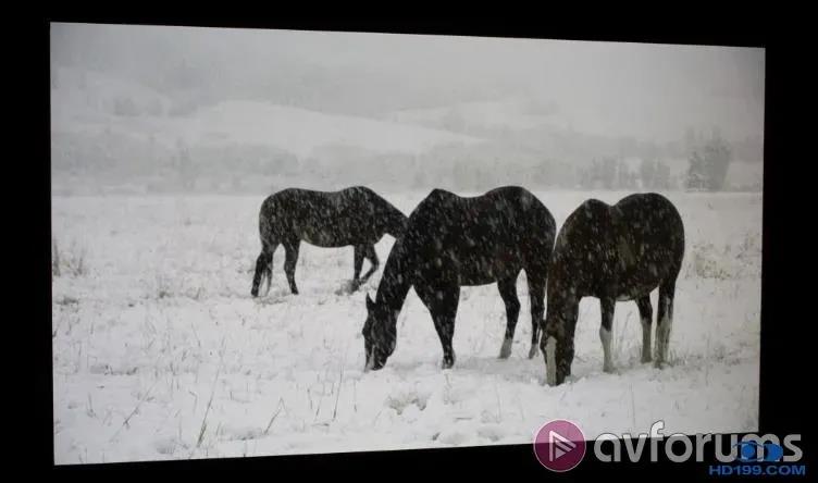 最新的JVC 4K投影机有它们自己的HDR动态色调映射功能,所以比较两者是有意义的。我们使用了Spears和Munsil的超高清蓝光,其中包括在1000、4000和10000尼特下分级的相同演示材料。有一个特别困难的场景,涉及到雪地里的马,色调映射需要保留雪景中的细节,同时还要保持马匹的深棕色。