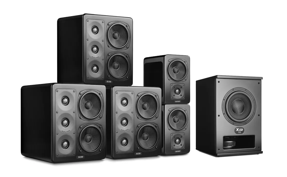 S-100采用小箱体设计,两个5.25英寸单元还原中低音,保证声压级以及瞬态表现,三个1英寸阵列式高音同样有此优势,三个分摊工作,让单元在大声压之下仍然工作在低失真范围。Miller&Kreisel以小箱体配合有源超低音的家庭影院环绕声配置,深刻地影响着家庭影院系统的发展。
